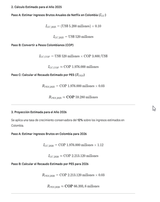 2. Otras Plataformas: Esta cifra no incluye a otras plataformas digitales multinacionales que también estarán sujetas a la PES (Google, Amazon/Prime Video, Meta, Spotify, etc.). El recaudo total por PES será la suma de todas ellas, siendo sustancialmente mayor que la cifra calculada para Netflix.