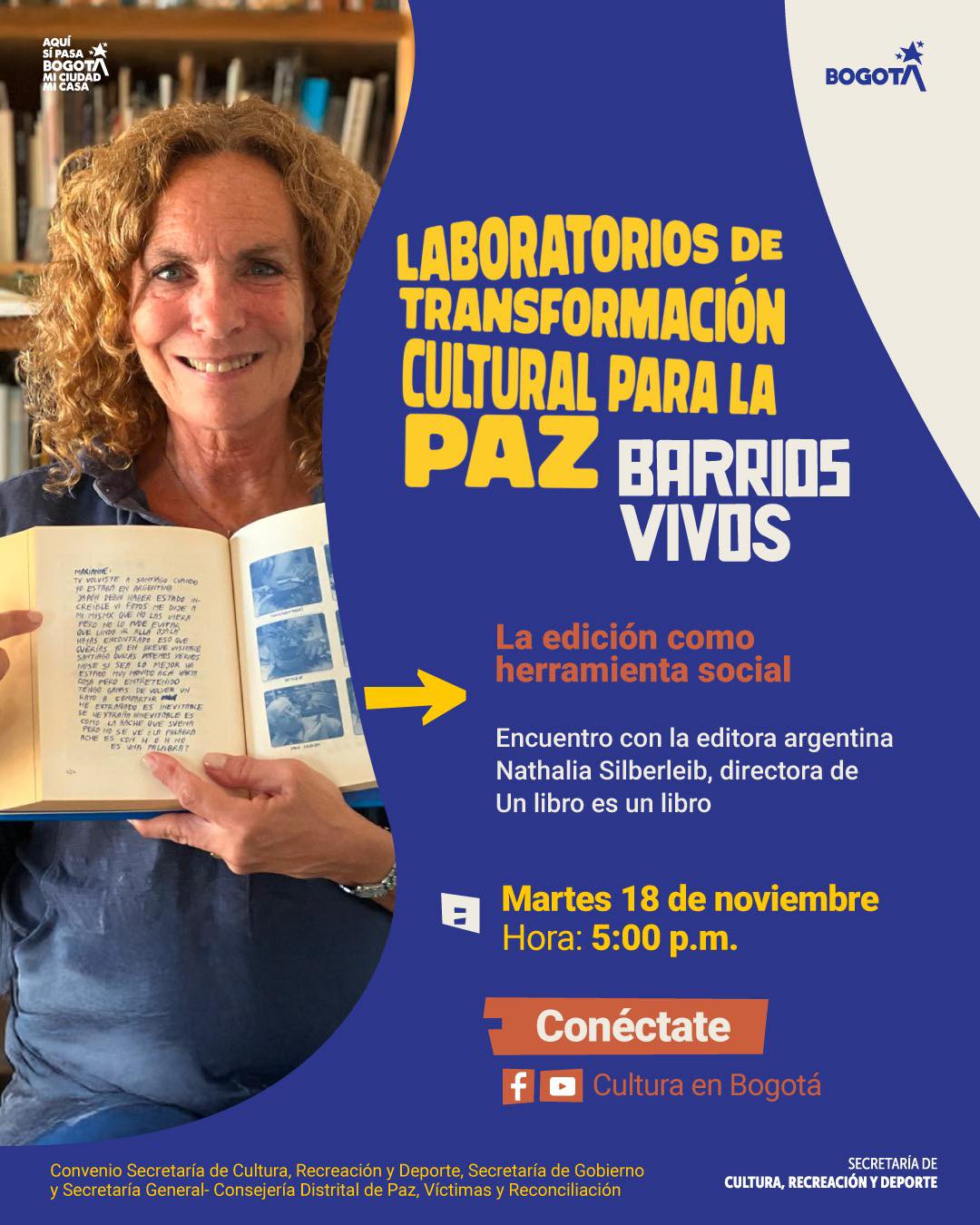 Este martes 18 de noviembre a las 5:00 p.m., conéctate con nosotros al webinar: “La edición como herramienta social”. Tendremos un encuentro inspirador con la editora argentina Nathalia Silberleib, directora de Un libro es un libro, en el marco de los Laboratorios de Transformación Cultural para la Paz – Barrios Vivos.