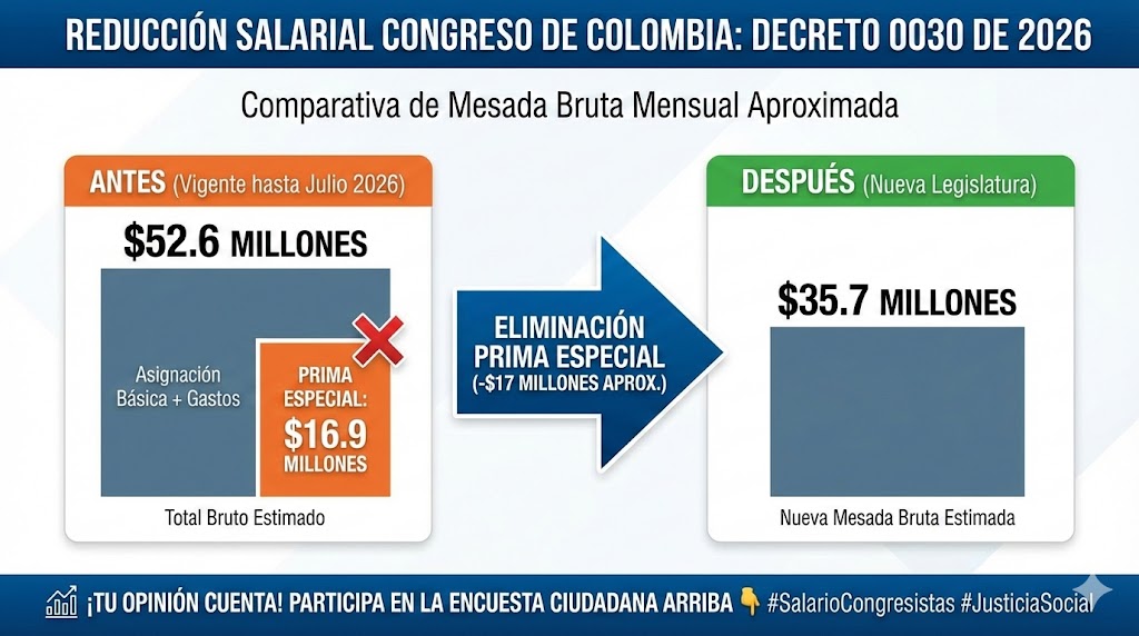Para entender el impacto real de esta medida en la búsqueda de la equidad, es necesario precisar las cifras que definen el nuevo panorama financiero del poder legislativo. Hasta la fecha, la remuneración bruta mensual de un congresista en Colombia alcanzaba los $52.642.323. Este monto se componía de la asignación básica, los gastos de representación y la hoy eliminada prima especial. Con la entrada en vigencia de la nueva normativa, se suprime de tajo el rubro de $16.914.540 mensuales, que constituía el factor salarial de privilegio.